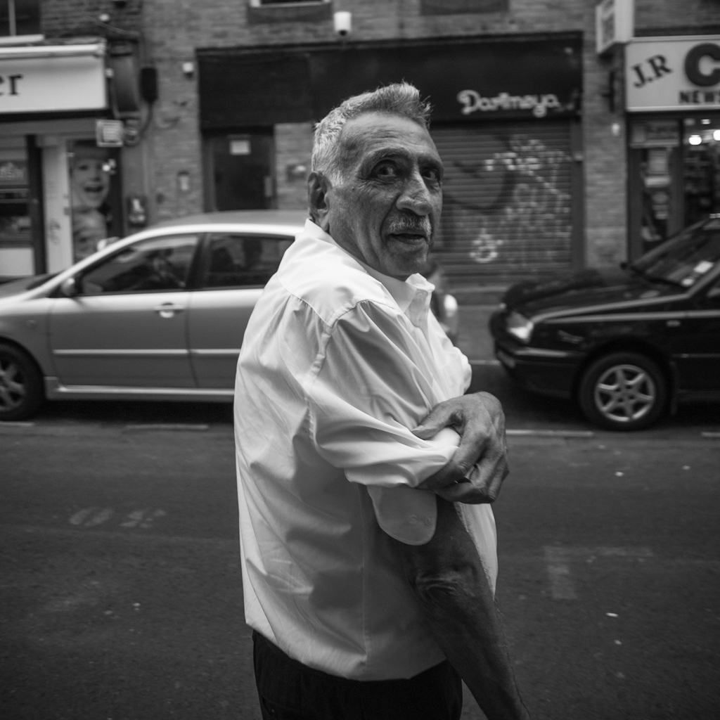 The most recent street portraits video that we put on YouTube attracted some interesting comments and questions. The chief of which was “Where are the photos from the shoot?” So today, I’m sharing the results from the Asked Portrait style video. We were out shooting on Brick Lane in East London when I caught the eye of the proprietor of one of the shoe stores. I don’t normally shoot stall vendors and street performers because they’re so used to it. But something about Ahmed was captivating. I grabbed a candid shot as I walked by before we stopped to chat with him. Ironically, the candid shot is actually quite good.